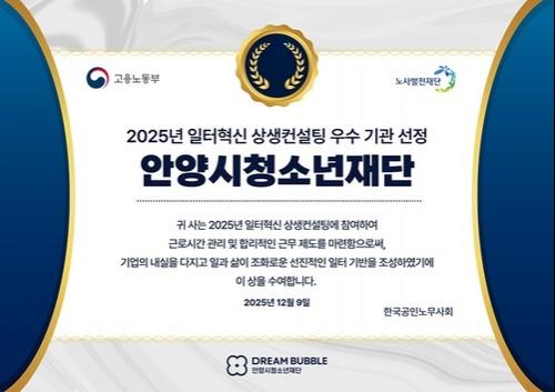 안양시청소년재단(이사장 최대호)이 고용노동부 ‘2025년 일터혁신 상생컨설팅’에서 우수 기관으로 선정됐다. 재단은 근로시간 관리 체계 정비와 합리적 근무제도 마련 등 노동환경 개선 성과를 인정받아 지난 12월 9일 한국공인노무사회가 수여하는 ‘일터혁신 바른경영상(특화형 부문)’을 수상했다.